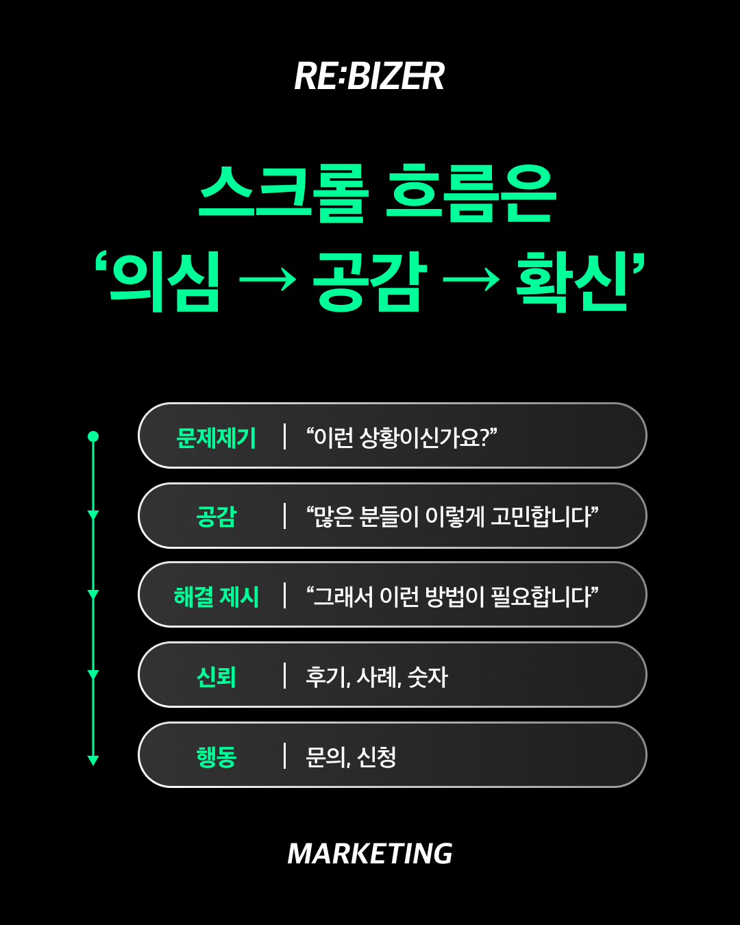 스크롤 흐름은 ‘의심 → 공감 → 확신’ 순서입니다