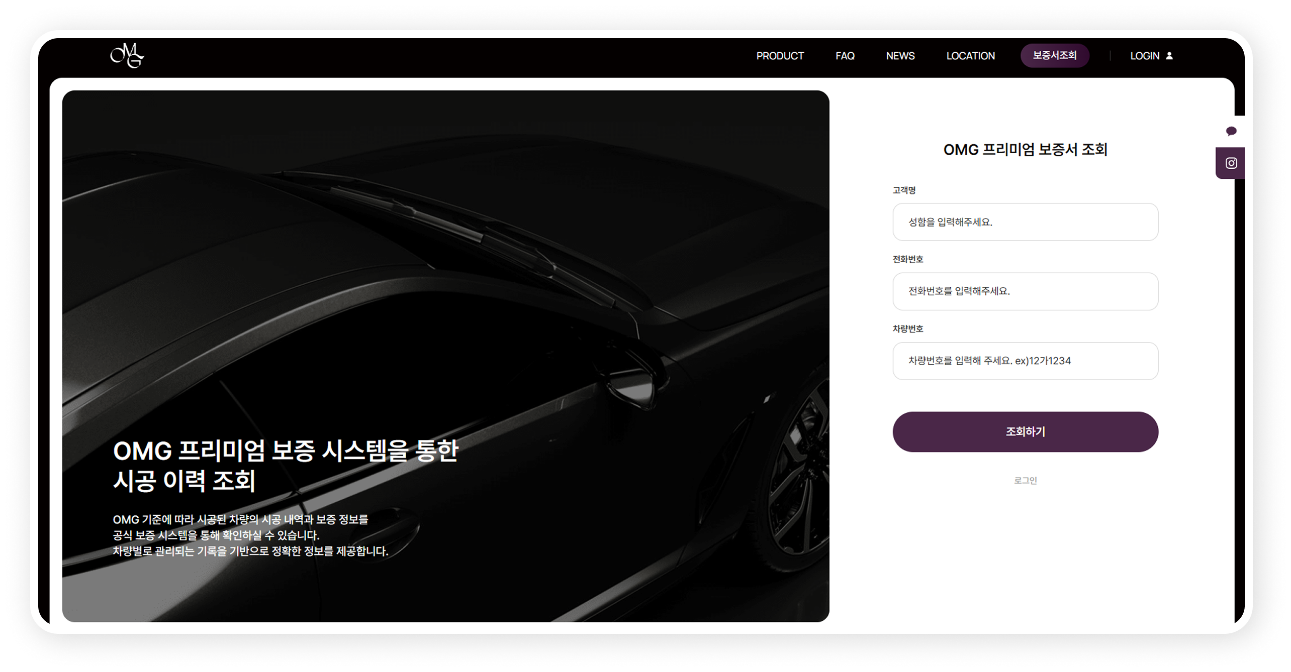시공 차량의 보증 정보와 시공 이력을 사용자가 직접 확인할 수 있도록 보증서 조회 시스템을 구축했습니다.