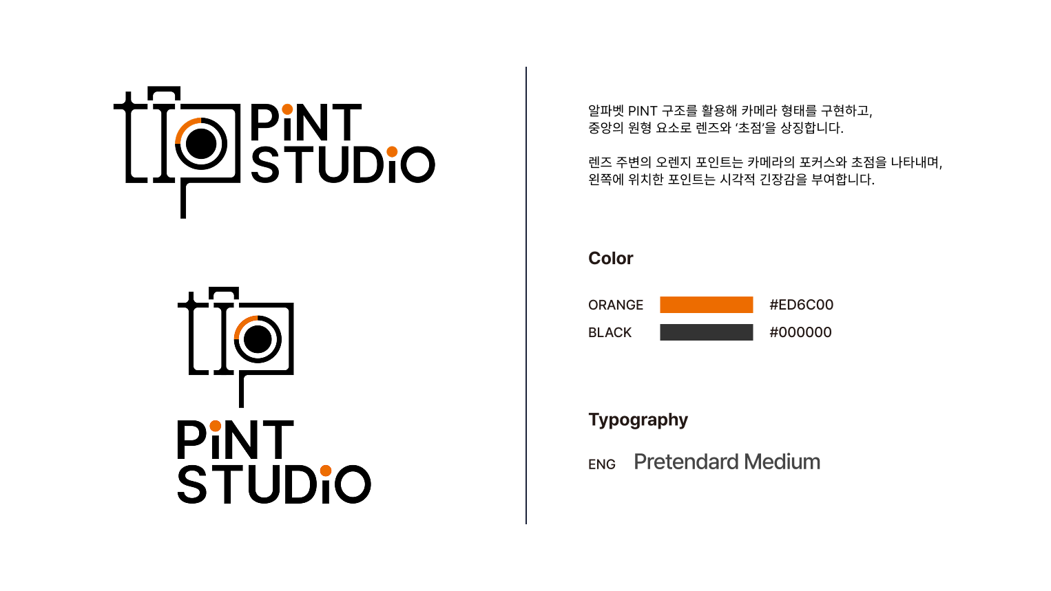 알파벳 PINT 구조를 활용해 카메라 형태를 구현하고, 중앙의 원형 요소로 렌즈와 ‘초점’을 상징합니다. 렌즈 주변의 오렌지 포인트는 카메라의 포커스와 초점을 나타내며, 왼쪽에 위치한 포인트는 시각적 긴장감을 부여합니다.