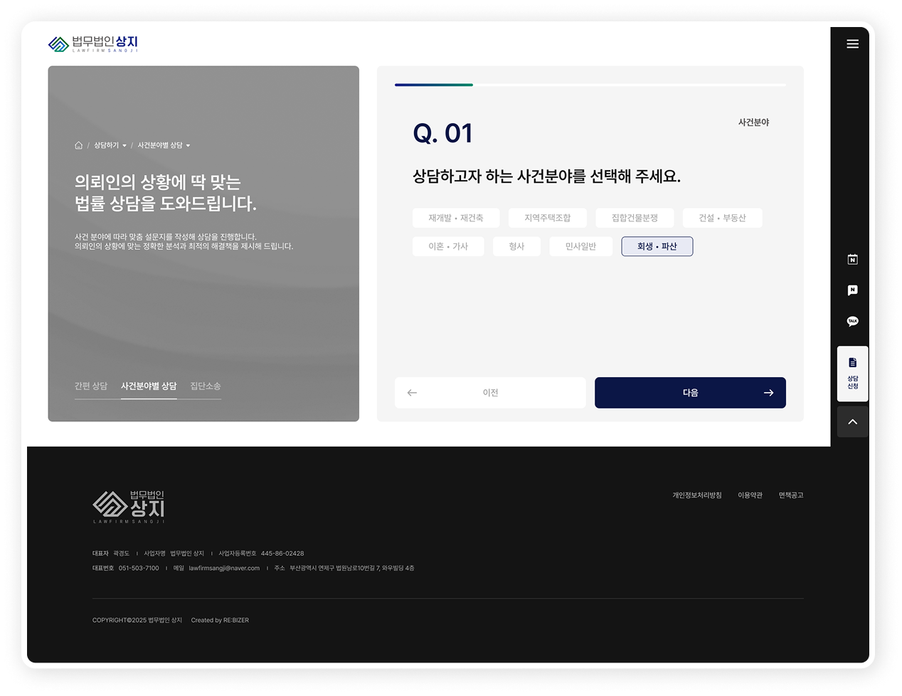 질문지를 통한 사건분야별 상담은 더욱 구체적인 상담을 제공하여 원활한 소통이 이루어질 수 있도록 했습니다.
