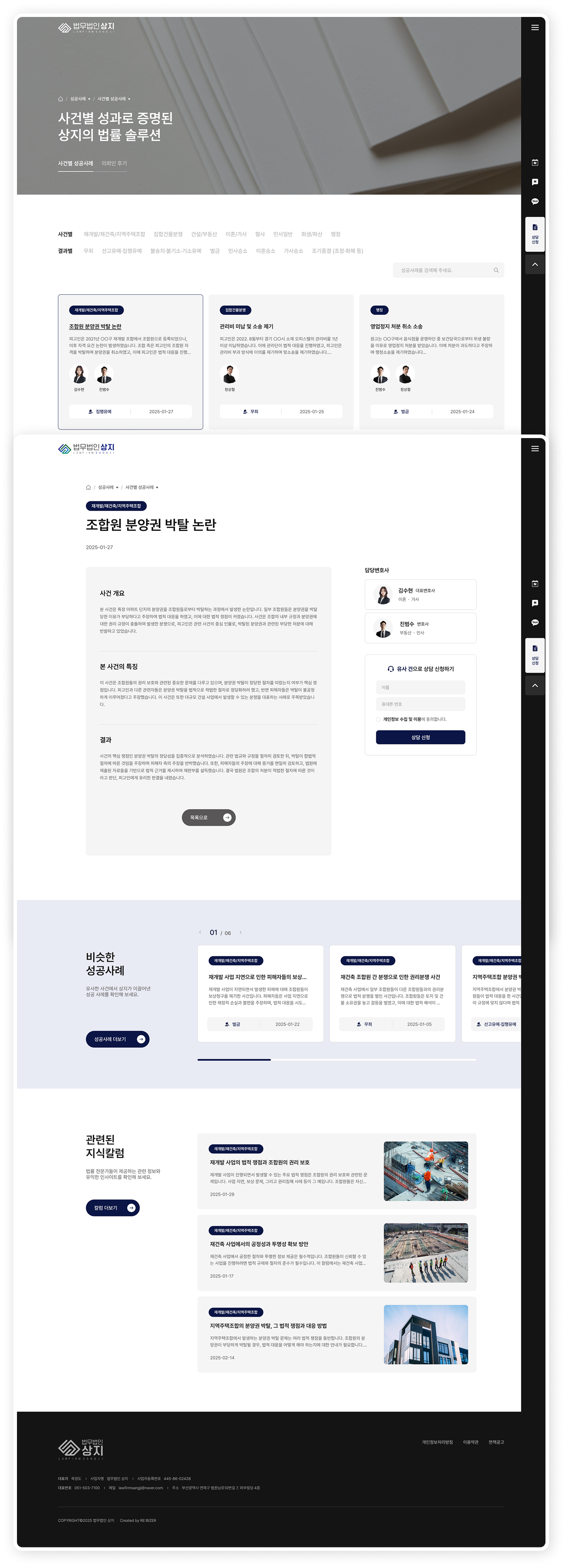 일반 페이지와 차별화된 구조를 적용하여 사건 진행 절차, 성공 사례, 비용 안내 등을 직관적으로 전달하며,