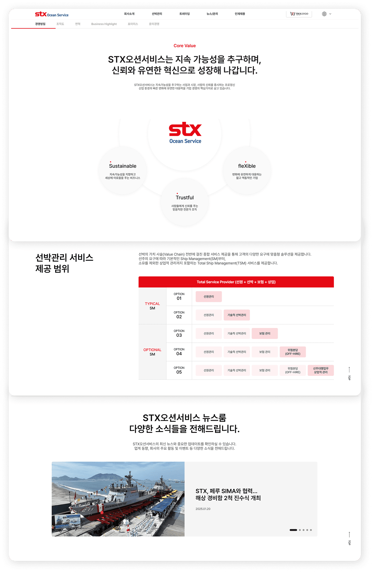 방문자가 STX오션서비스의 비전과 핵심 역량에 자연스럽게 몰입할 수 있도록 구성하였으며,