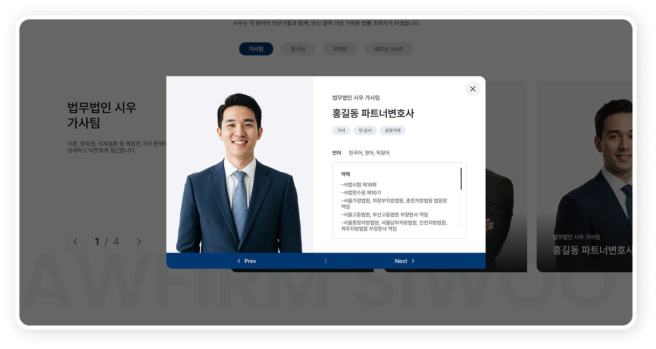 전문 변호인단을 시각적으로 강조하여 브랜드 신뢰도를 효과적으로 전달하도록 구성했습니다.