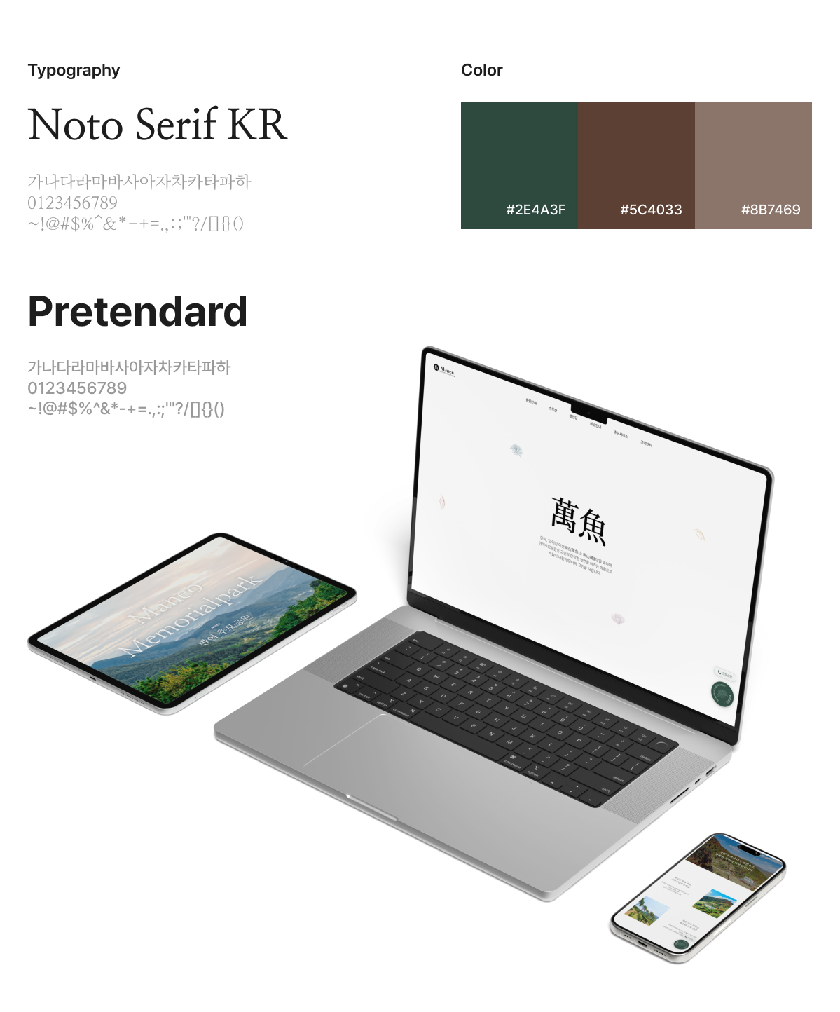 메인페이지는 차분하고 자연 친화적인 비주얼을 중심으로